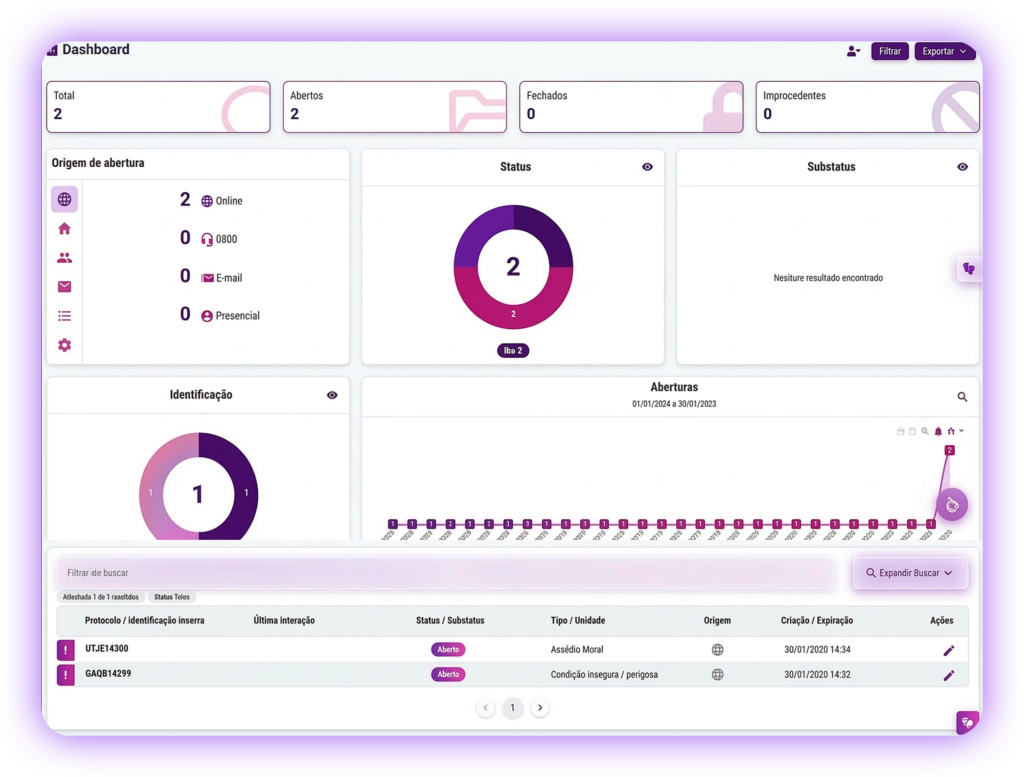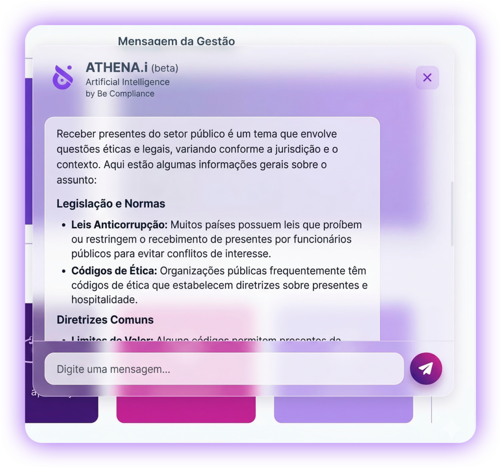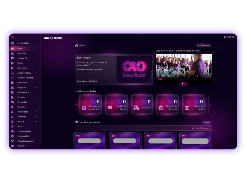 Nosso software combina estratégias integradas e tecnologia de ponta para uma gestão de Compliance eficiente e descomplicada. Realize a avaliação de riscos, gestão de reportes, treinamentos, documentos e diligências de terceiros, garantindo transparência nos processos, conformidade nos negócios e elevação da reputação e cultura da sua empresa.