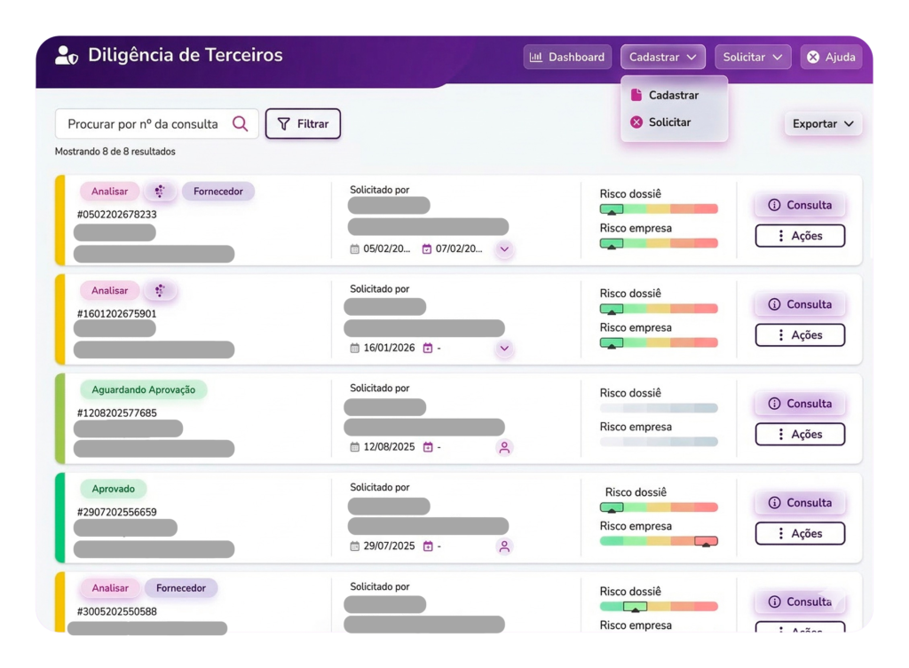 Nosso módulo de diligência automatiza e simplifica a análise de riscos, garantindo que sua empresa esteja protegida em todas as frentes, desde parceiros e fornecedores até colaboradores.