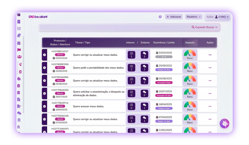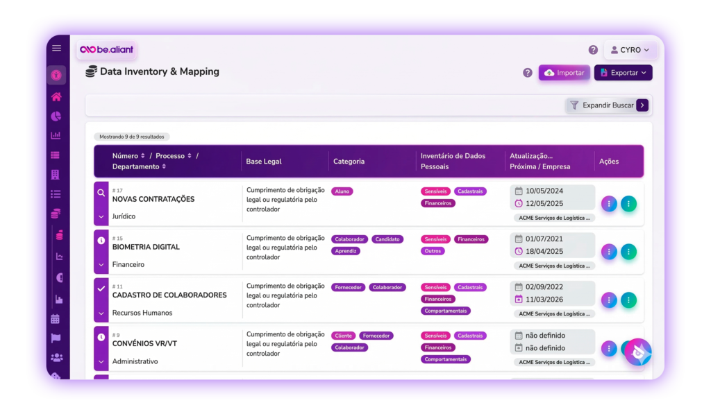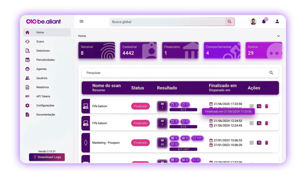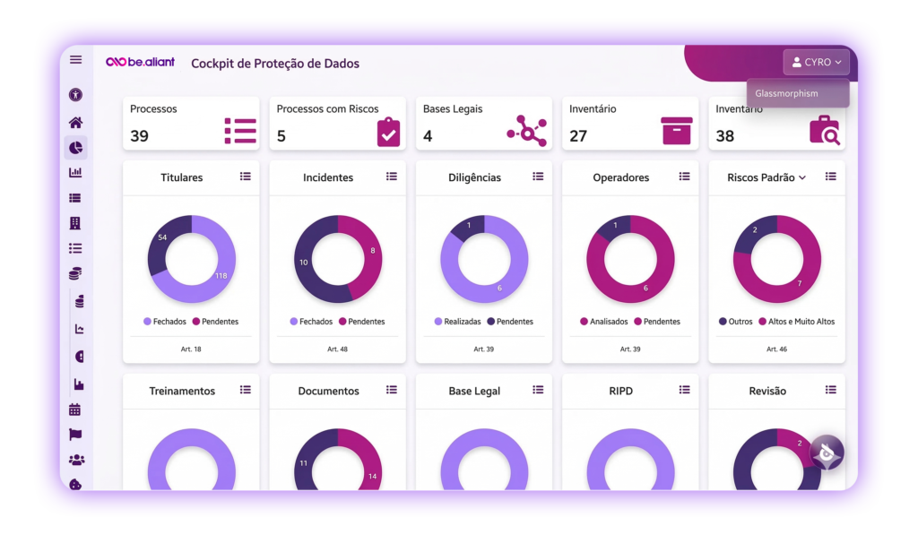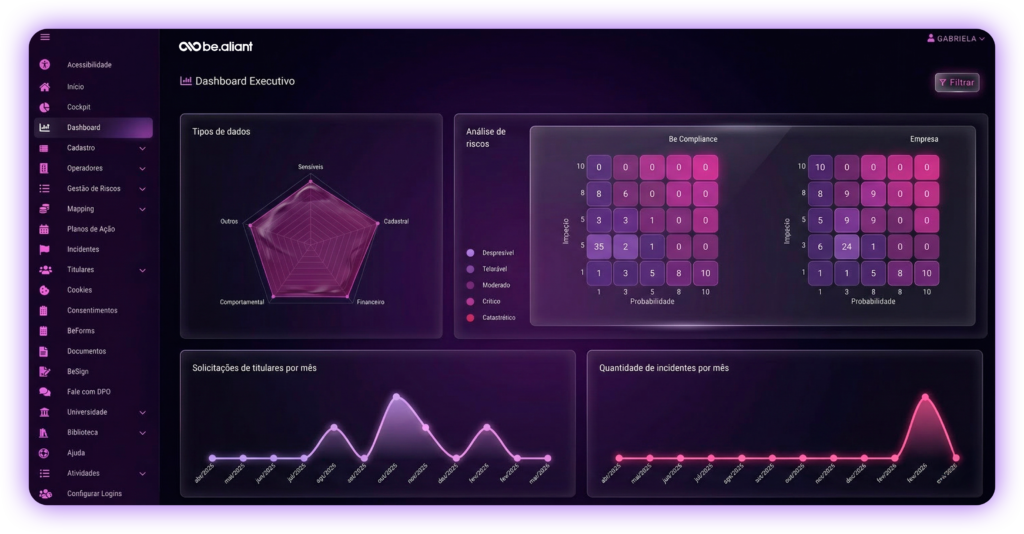 Com uma interface intuitiva, é fácil monitorar processos, avaliar o status de segurança e tomar decisões rápidas para manter sua empresa em conformidade.